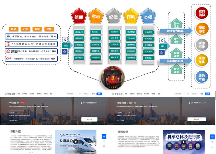 3.上好课程思政课。一是系统构建课程思政图谱,全面梳理铁道专业课程知识点,深度挖掘思政元素,开发了系统化、可视化的课程思政知识图谱,为精准融入思政教育提供清晰指引;二是打造特色课程思政资源库,充分发挥学校与铁路行业的“血缘优势”,开发了历史、产业、企业、学校交融并蓄的课程思政资源库,实施“一核引领、双体育人、四堂联动、五维聚力”课程思政建设模式,传承和践行“人民铁路为人民”初心,推进课程思政内涵式发展;三是建设高水平课程思政示范课程,重点打造了一批课程思政示范标杆课程,其中,《铁道概论》《机车总体及走行部》2门课程获批省级课程思政示范课;《电力机车操纵》《轨道交通机械技术》等5门课程获评校级课程思政示范课。