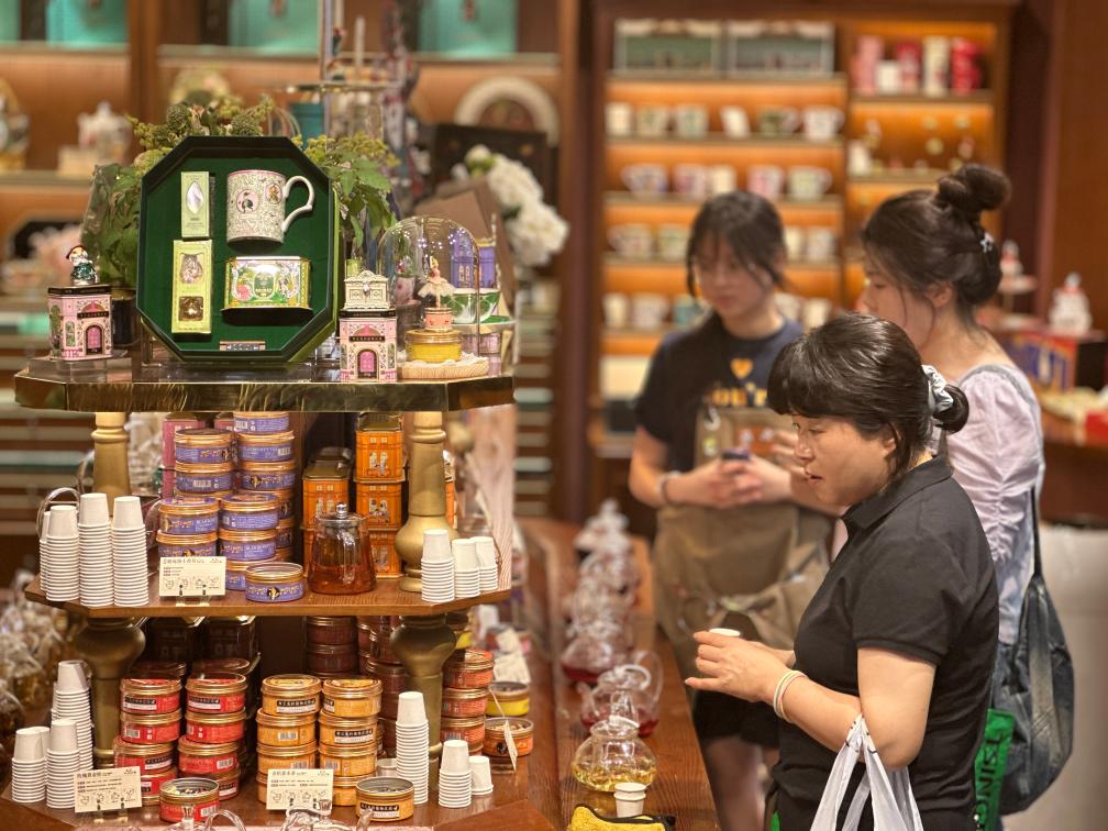 7月29日,在青岛市大鲍岛文化休闲街区,游客正在购物。新华社记者张钟仁 摄