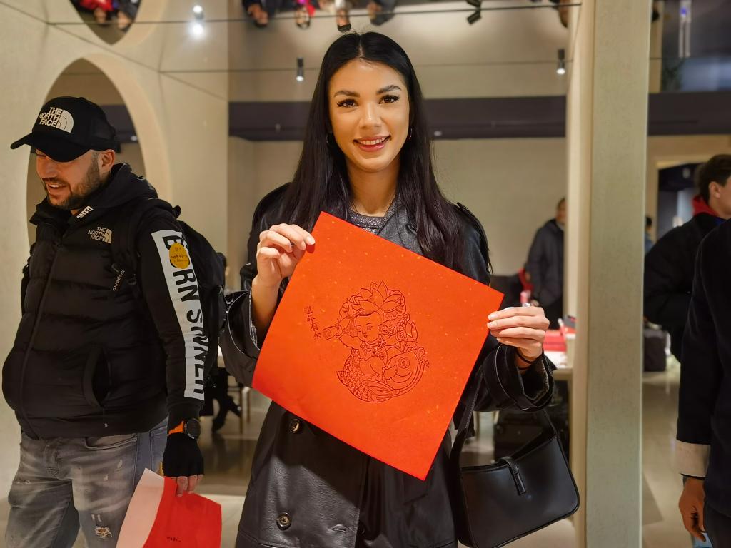斯洛伐克游客卡特琳娜大胆尝试了拓印技艺——将宣纸覆在刻有图案、沿纹路已涂抹墨汁的木板上,并仔细压实,揭开便是一幅“连年有余”图。“这是我从来没有过的体验,非常有意思!”卡特琳娜一直期待来华旅游,尤其喜爱中国历史文化。