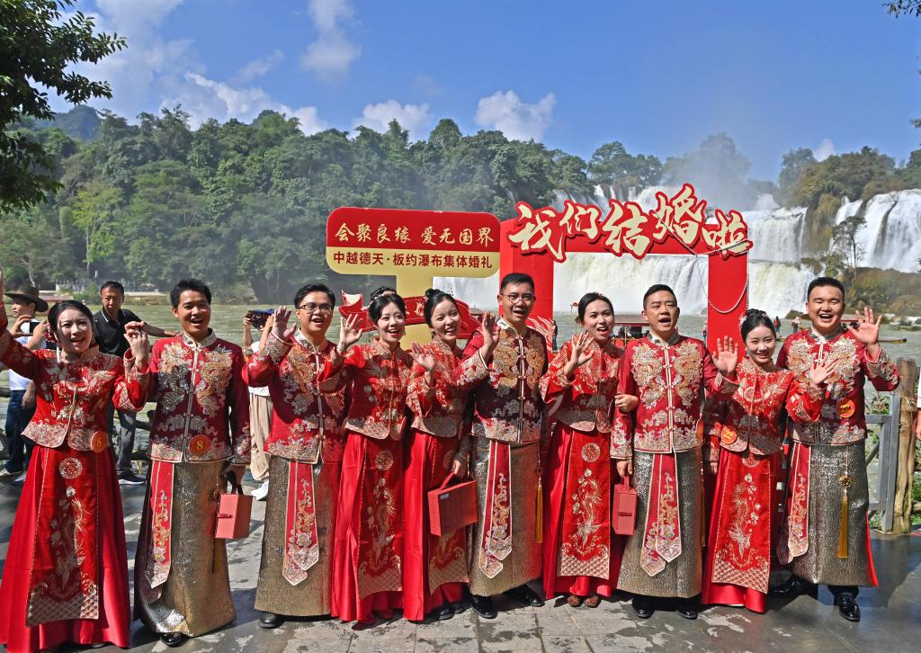 新华社南宁10月19日电(记者田子骏、邹雨沁)18日,在广西崇左市大新县的中越德天(板约)瀑布跨境旅游合作区,秋日的阳光洒在奔腾的瀑布上,水雾弥漫中,一场别开生面的集体婚礼正在举行。