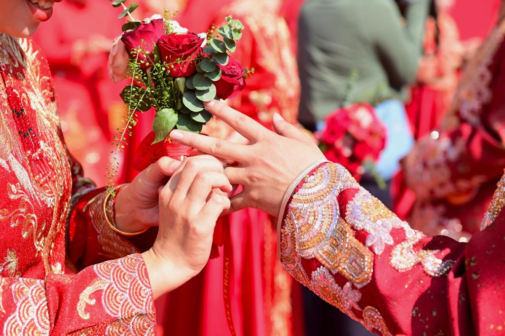新人在婚礼上交换戒指。新华社发(韦世仙 摄)