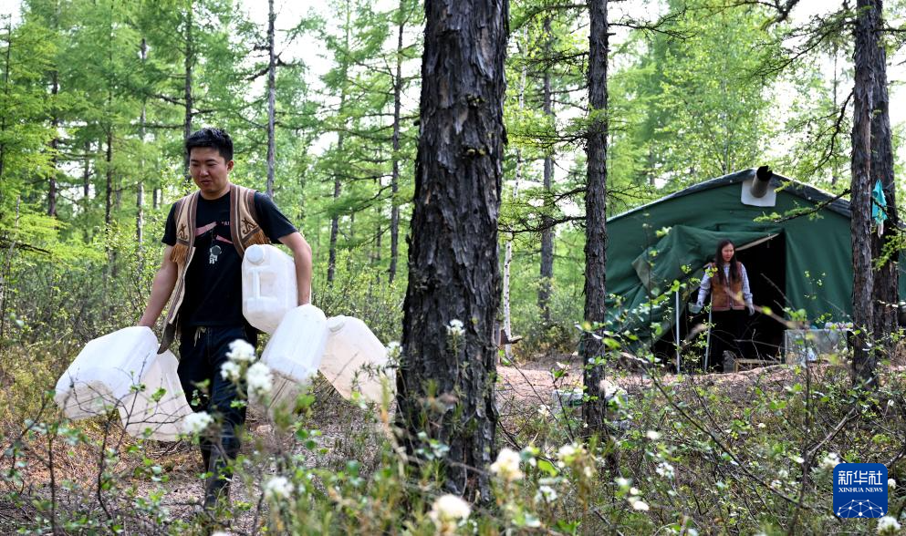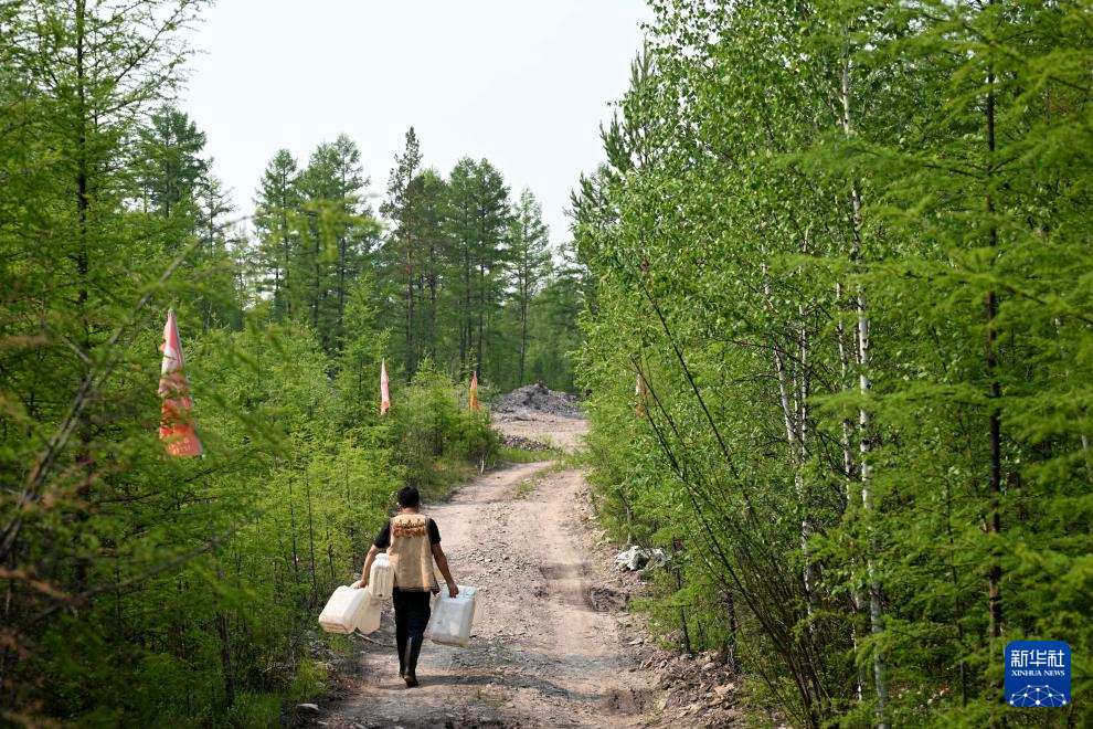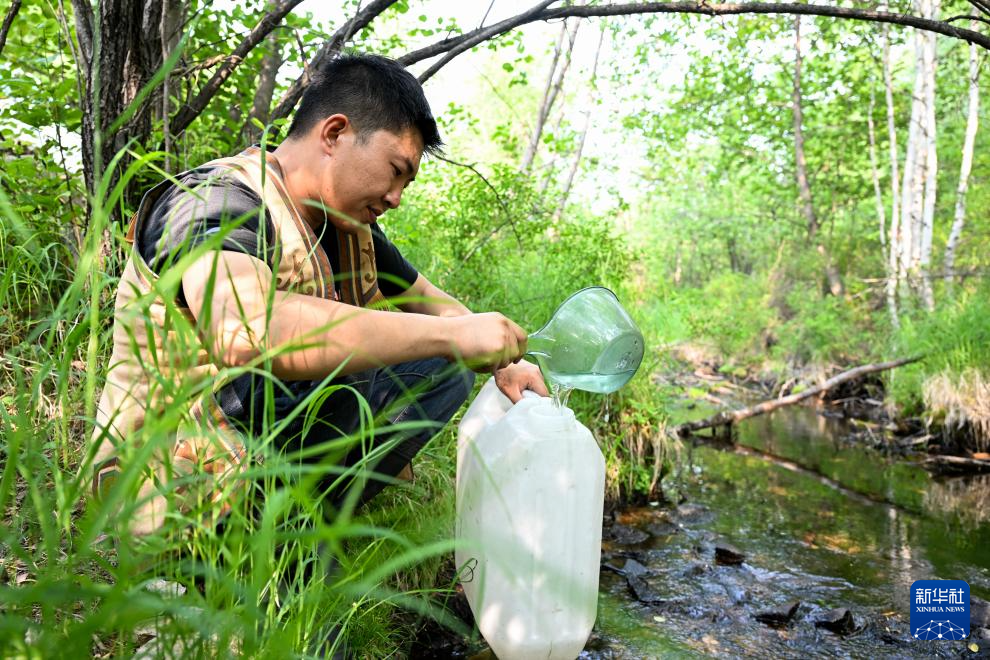 7月3日,吴启明在根河市金河镇一处小溪中取水。