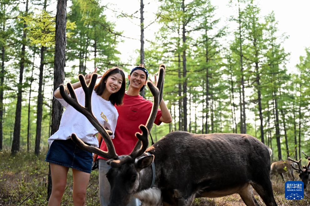 7月3日,游客在放养点与驯鹿合影。