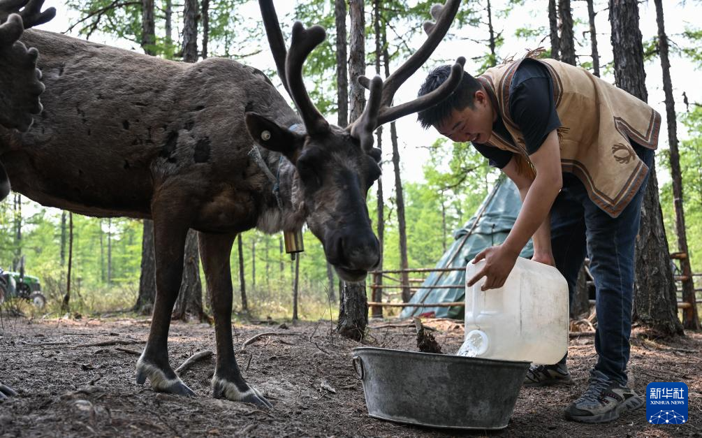 7月3日,吴启明在放养点给驯鹿喂水。