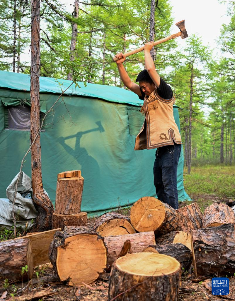 7月3日,吴启明在放养点劈柴。