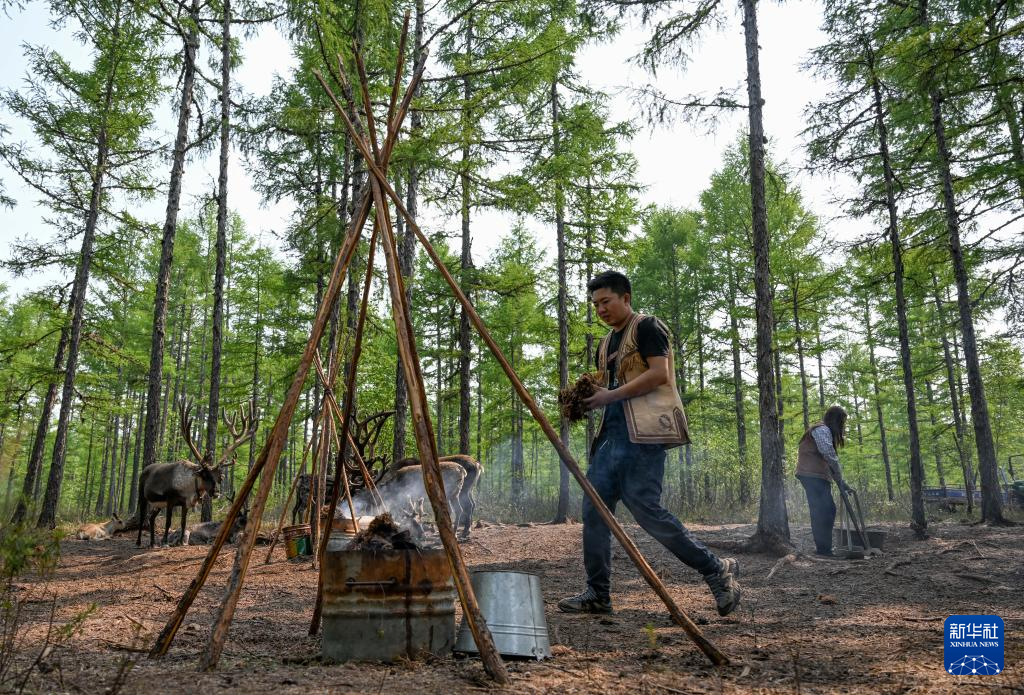 7月3日,阿尤莎夫妇在放养点忙碌,吴启明在搬运用于熏烟驱虫的植物,妻子阿尤莎在清理鹿粪。