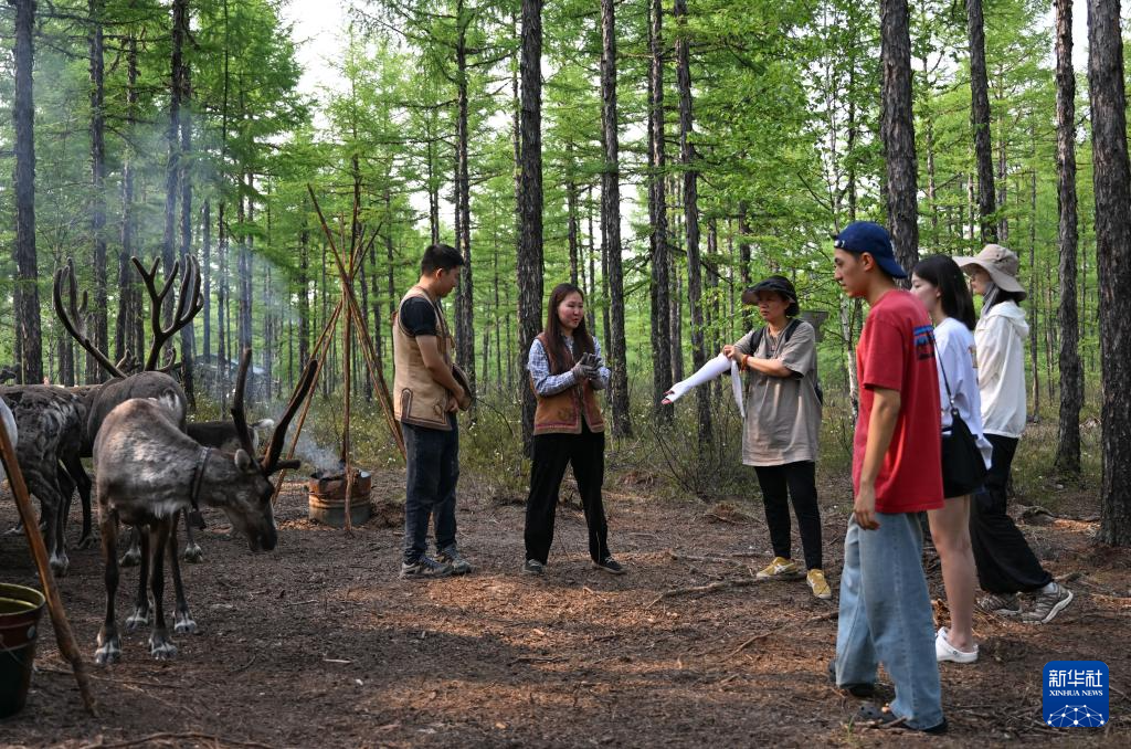 7月3日,阿尤莎(左二)在放养点向游客介绍使鹿文化。