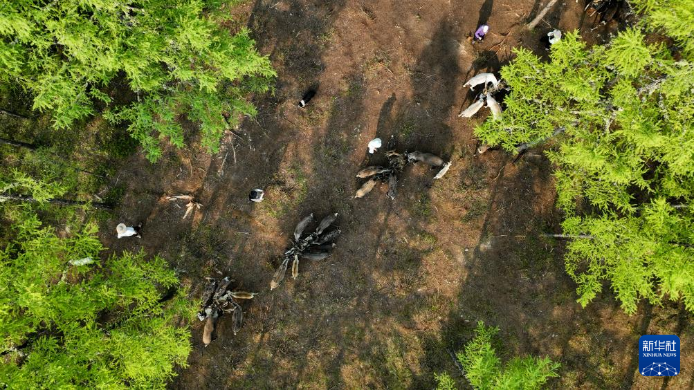 7月3日在内蒙古呼伦贝尔市根河市金河镇阿尤莎驯鹿放养点拍摄的驯鹿(无人机照片)。
