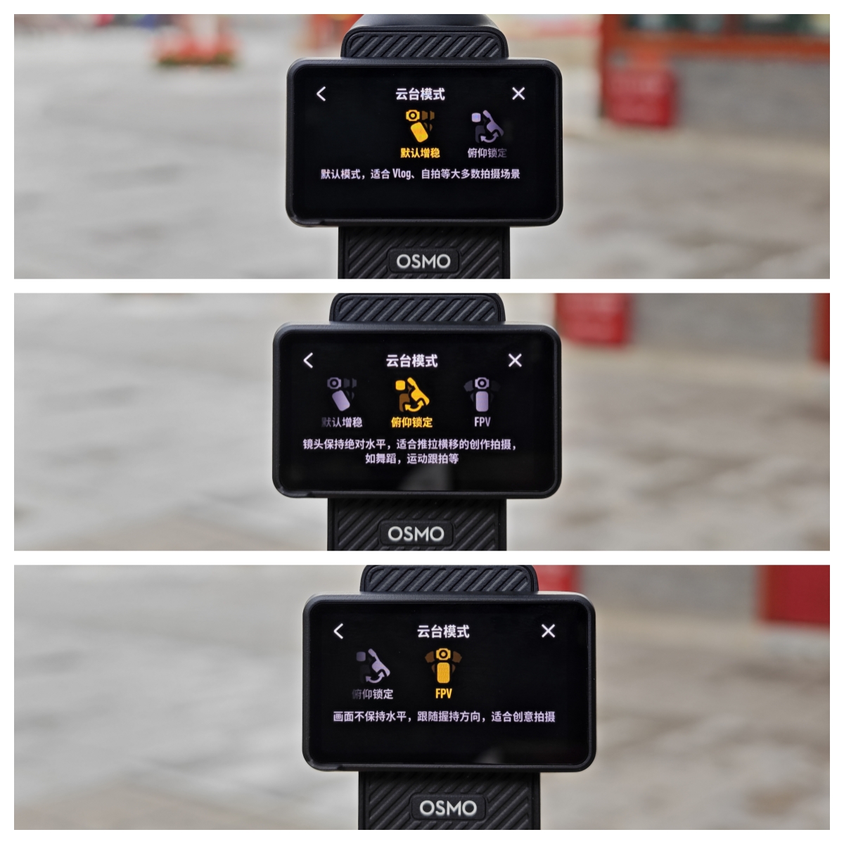 Pocket 3支持三种云台云台跟随模式,分别是默认增稳、俯仰锁定和FPV,在云台模式界面,也提供了注释,帮助使用者更好的理解模式功能和适用场景。