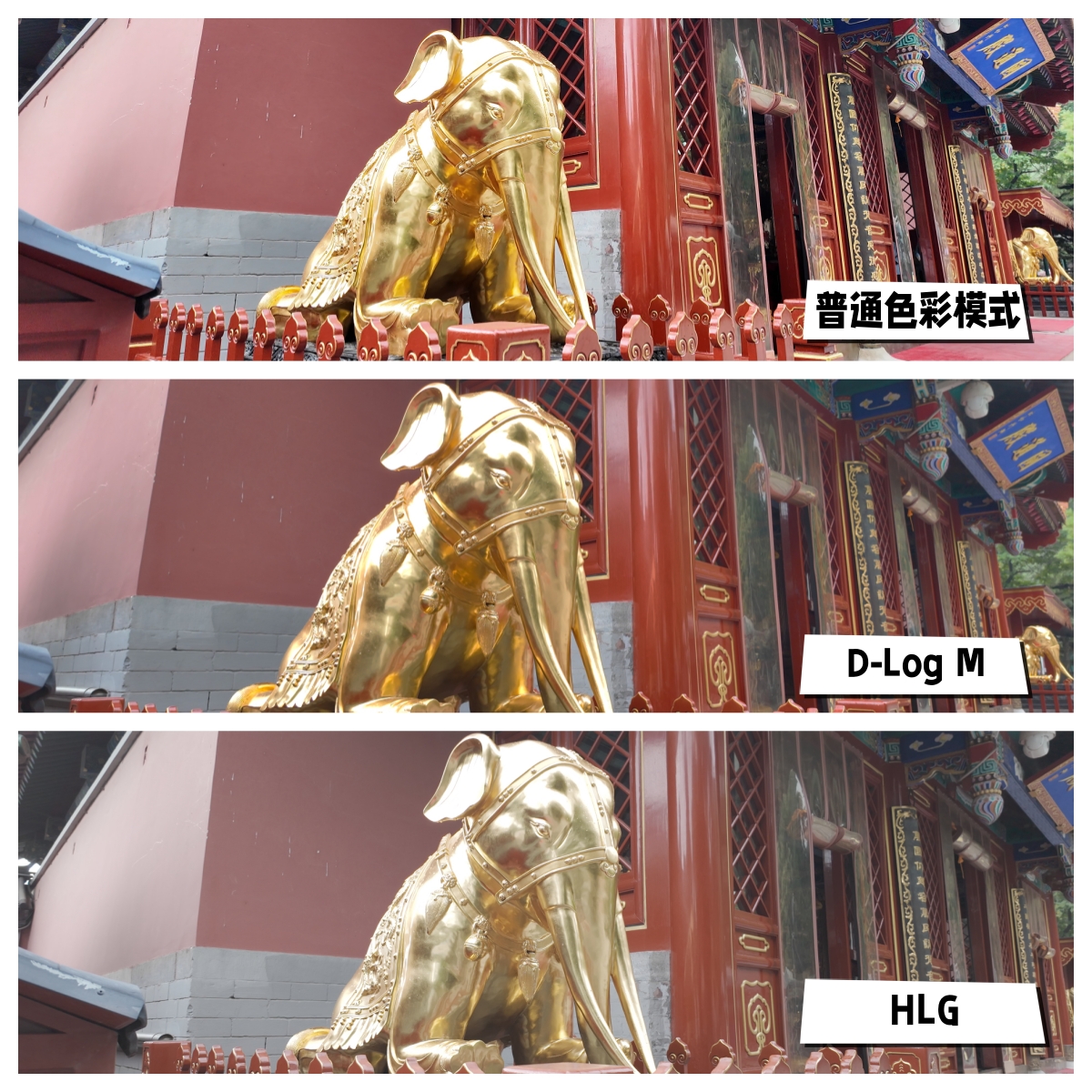 色彩方面提供了三种模式,分别是普通模式,这个模式足够应付日常拍摄。另外HLG和D-Log M模式提供了10bit录制。