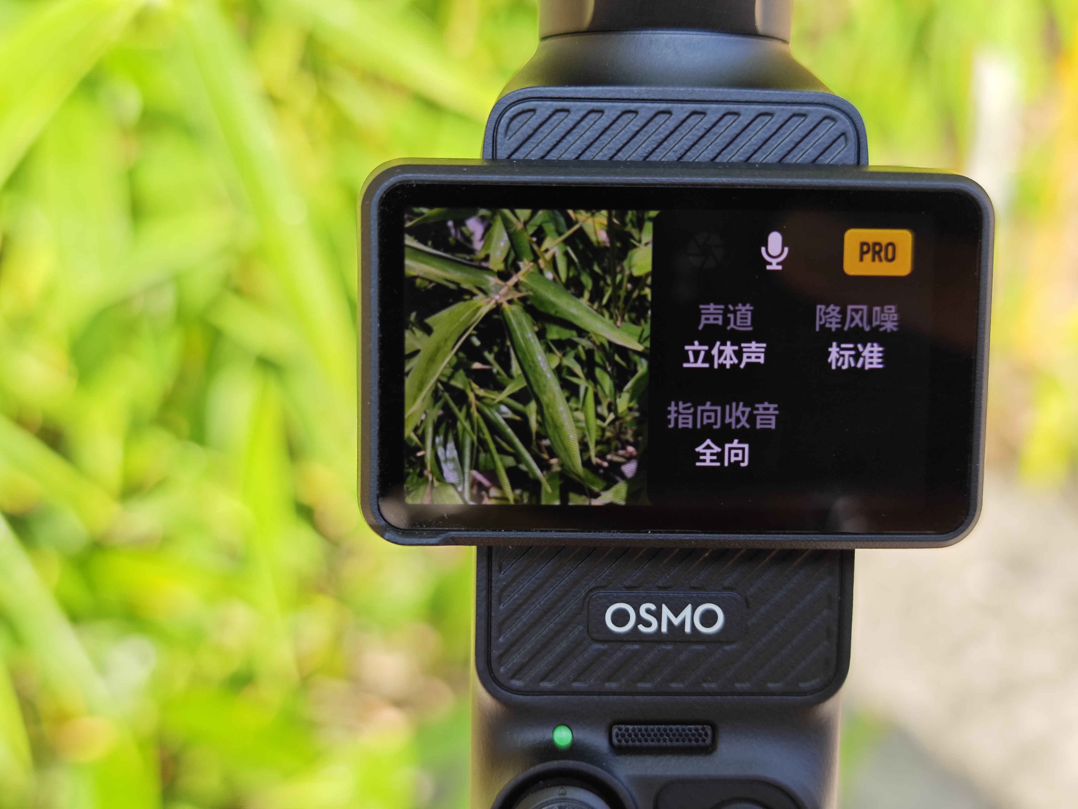 Pocket 3机身自带三阵列麦克风,可以通过切换选择全指向收声或前/后收声。