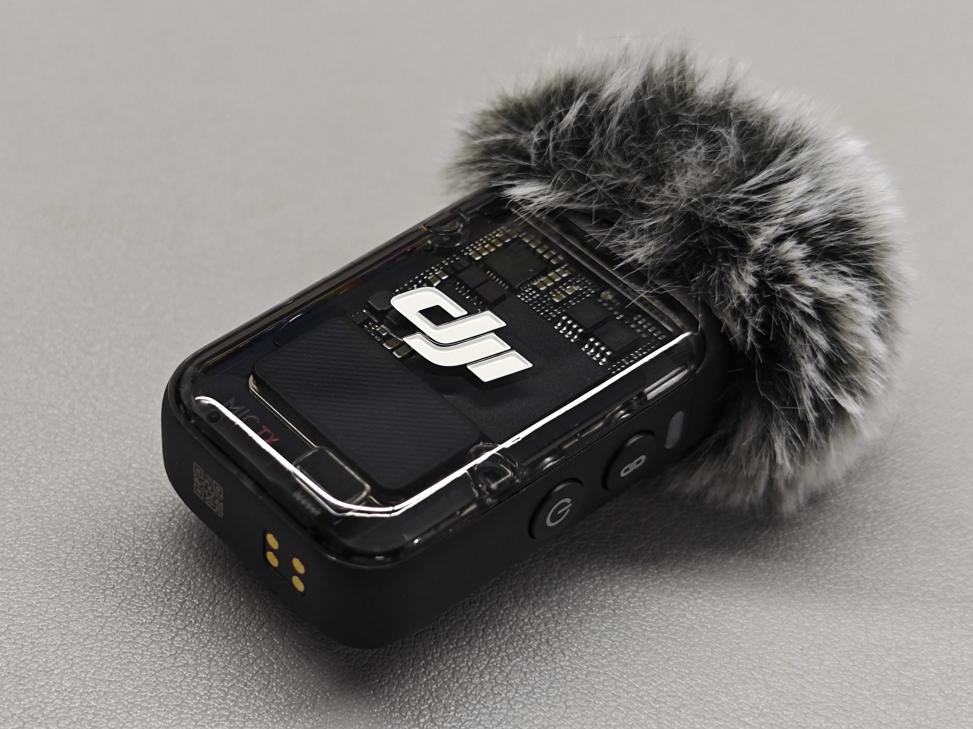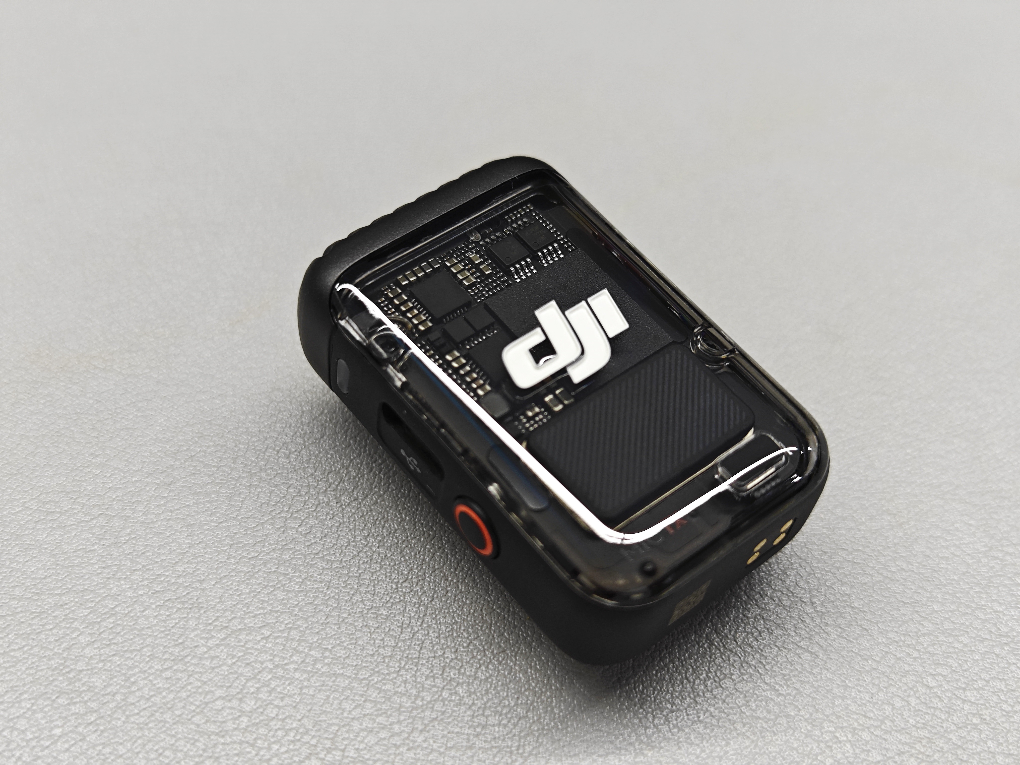 同时,Pocket 3机身内置Wi-Fi&蓝牙模块,可以连接“全能套装”内配套的DJI Mic 2,方便有更高收声需求的创作者使用。DJI Mic 2同样采用了黑色为主色调,橙色点缀的组合方式。正面结合时下流行元素,印有“DJI”字样的透明外壳覆盖在电路元器件上,科技感满满。机器支持6小时续航,同时新增了8GB内录和降噪功能。