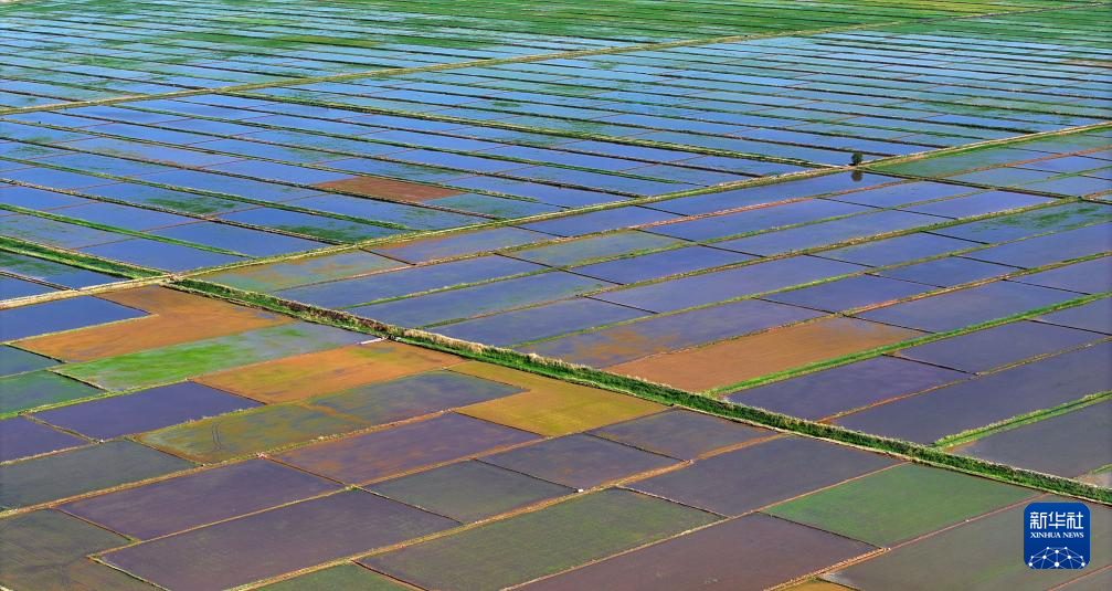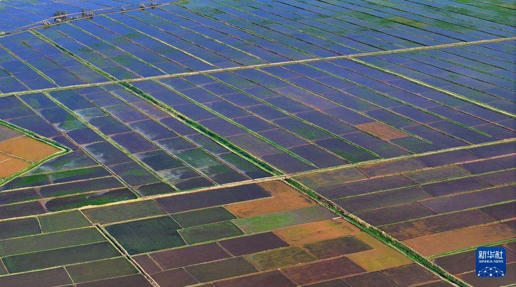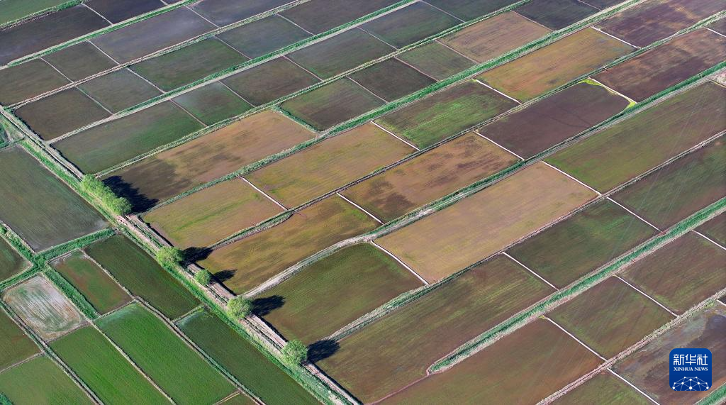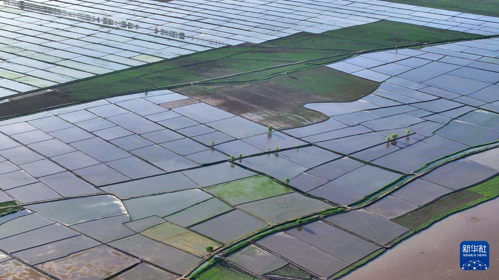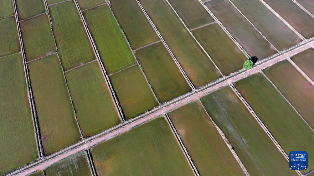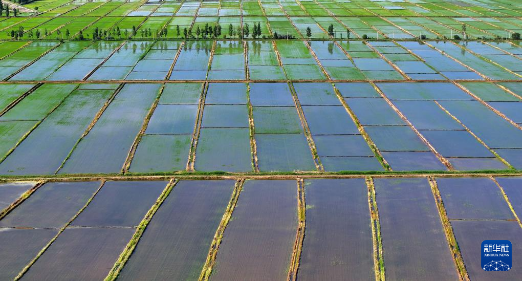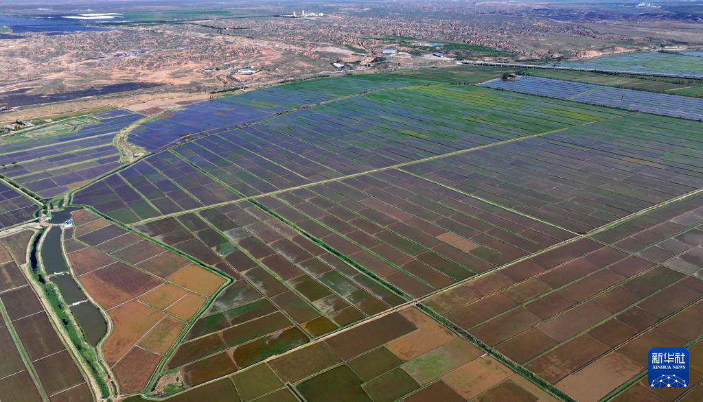 近日,宁夏黄河灌区水稻插秧季结束。位于银川平原的黄河两岸,一块块稻田里,绿莹莹的秧苗,在阳光和水面的映照下绿意盎然,一派生机景象。