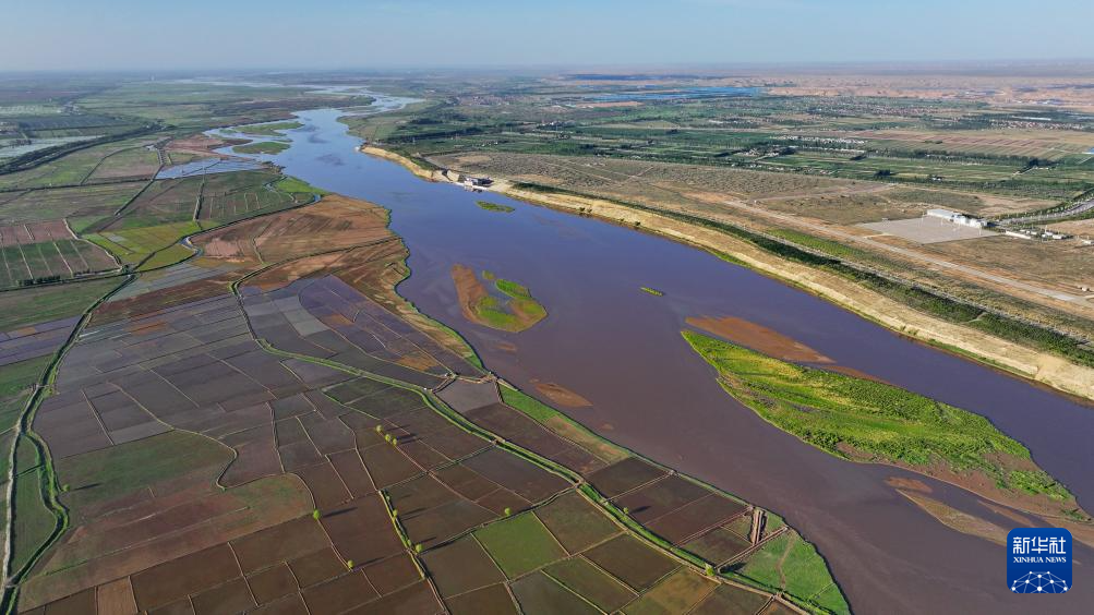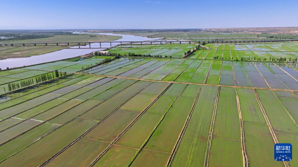 这是5月30日无人机拍摄的位于宁夏银川市境内黄河岸边的稻田。