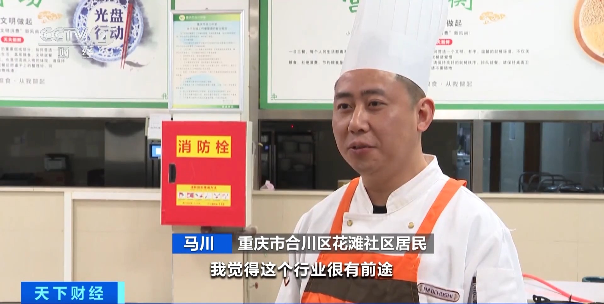 重庆市合川区花滩社区居民 马川:我有几个朋友都在火锅店里面当炒料师傅,一个月最低的都有一万多元,高的三四万元一个月,我觉得这个行业很有前途,我看好这个行业。
