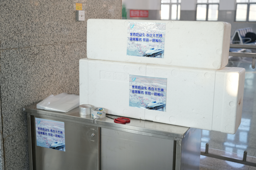 车站不仅为旅客准备了口罩、暖手宝等驱寒用品,还为参加冬捕的旅客升级了“鱼鲜打包”特色服务。