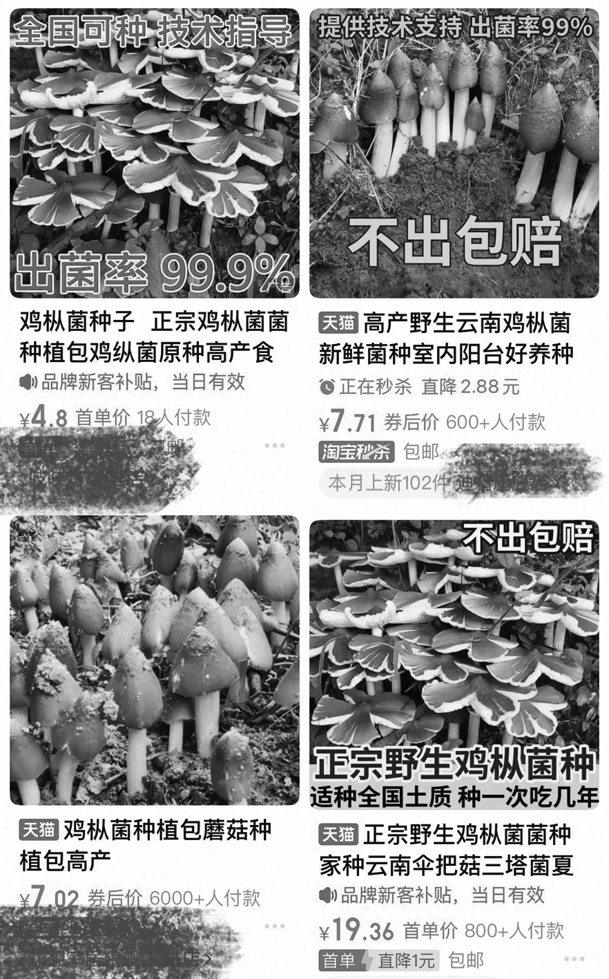 记者在多个电商平台搜索鸡枞菌种子,发现售卖此类菌种的店铺不少,价格从几元到十几元不等,有的店铺销售量达2万多单。这些店铺的宣传页面上均明确注明,鸡枞菌是食用菌,吃法很多,可以入菜,简单易种。记者随机询问了一家销售量较大的店铺,店主告诉记者,店铺售卖的菌种可回家放在花盆里自行种植,每天用喷壶把土壤喷湿,隔天通风,等10多天后,就可采摘食用。该店铺的宣传页上写着此鸡枞菌来源于云南,但当记者问及发货地时,对方表示可多个仓库发货,并不会从云南统一发出。记者又咨询了另一家店铺,该店铺介绍页面上写着“碰水就长,花小钱办大事,一出一窝,能吃十年。”记者咨询后,对方发来种植指南,并表示这个菌是无毒可食用的。记者询问如果种不出来,可否退款,对方表示不保证。记者继续询问为何原产地与发货地不一致,对方未回复。第二天,记者发现该店铺的购买链接已下架。
