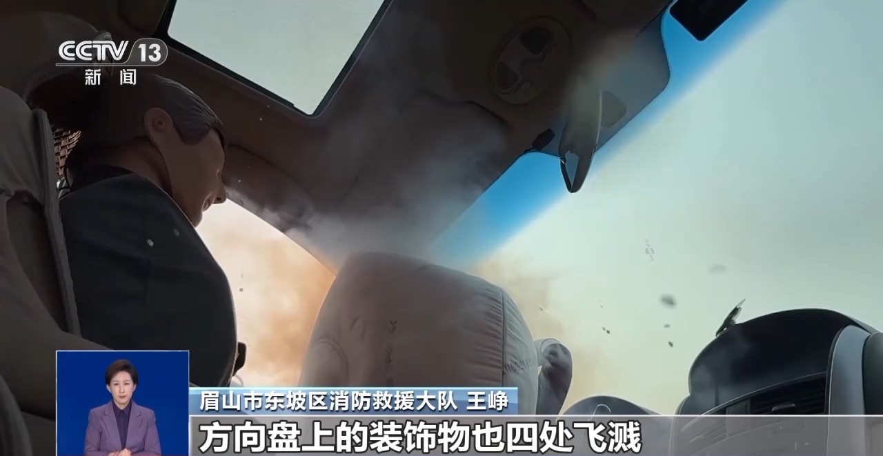 四川省眉山市东坡区消防救援大队 王峥:通过刚刚的实验,我们可以看到,随着气囊高速弹出,方向盘上的装饰物也四处飞溅,可能会对驾驶员五官和皮肤造成不同程度的伤害。