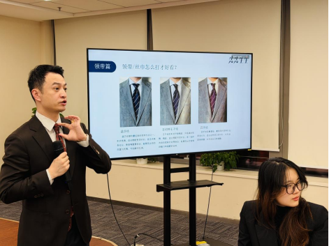 培训聚焦两大核心模块,从基础穿搭到细节配饰,构建起全方位的职业形象体系。在西装穿搭基础技巧环节,讲师摒弃“穿贵即是专业”的误区,围绕金融行业“稳健、可靠”的核心气质,通过版型拆解、面料对比、现场试穿等直观方式,详解正装版型与身材的适配逻辑、不同场合的着装规范。针对商务洽谈、客户接待等高频场景,讲师逐一梳理穿搭误区——从西装肩线的贴合度到裤长的黄金比例,从衬衫领口的整洁度到袜子颜色的选择,每一个影响专业形象的细节都被细致拆解。同时,讲师还结合一对一指导,帮助参训学员快速找到适合自己的着装方案,让“穿对”成为专业表达的第一步。