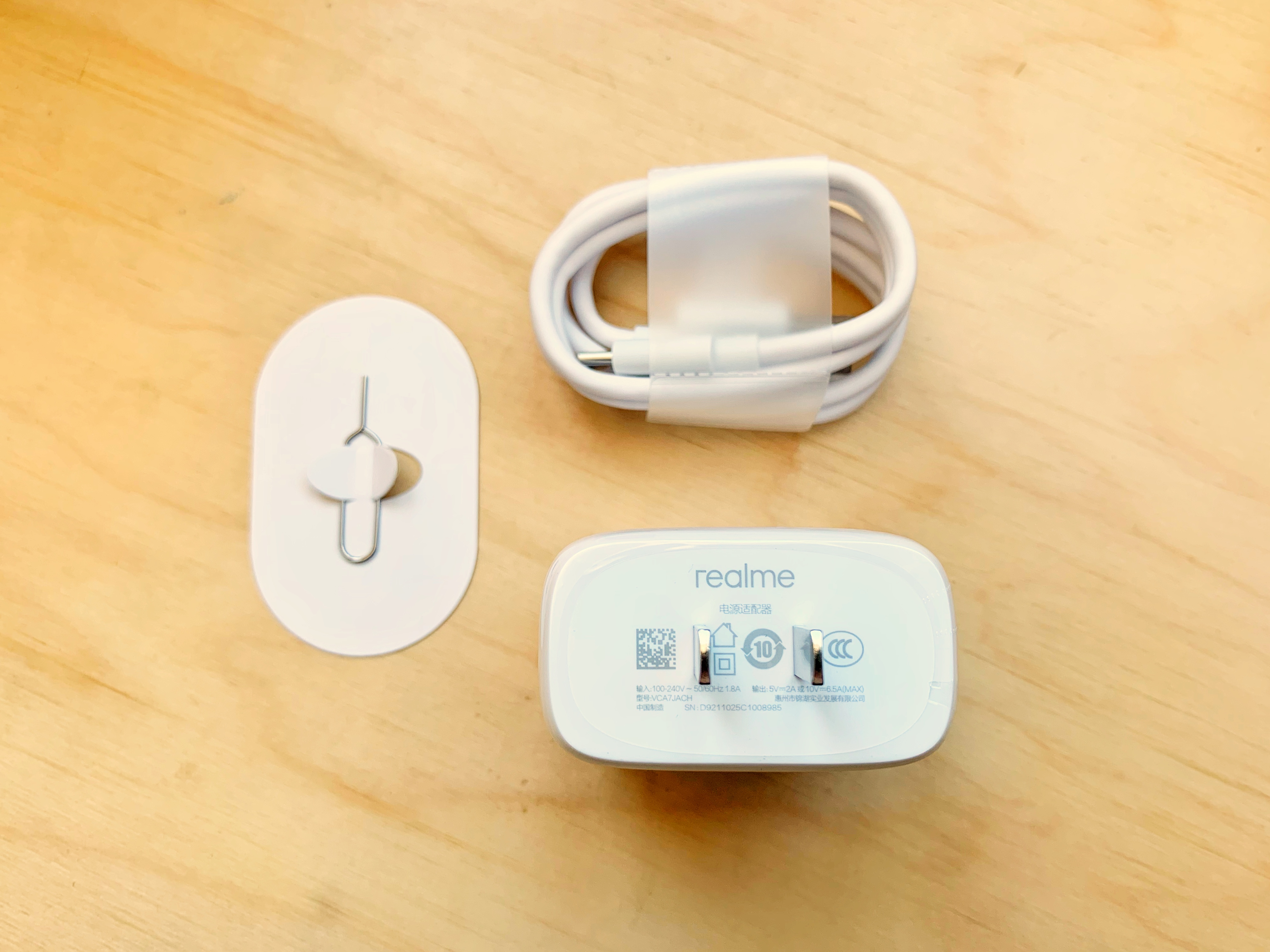 在包装的底层则是realme Q3 Pro 狂欢版的电源适配器以及数据线,其中该机附送的是50W 智慧闪充的电源适配器,外观圆润小巧,另外还支持给realme其他近代产品进行充电,也达成了另一种形式上的环保。