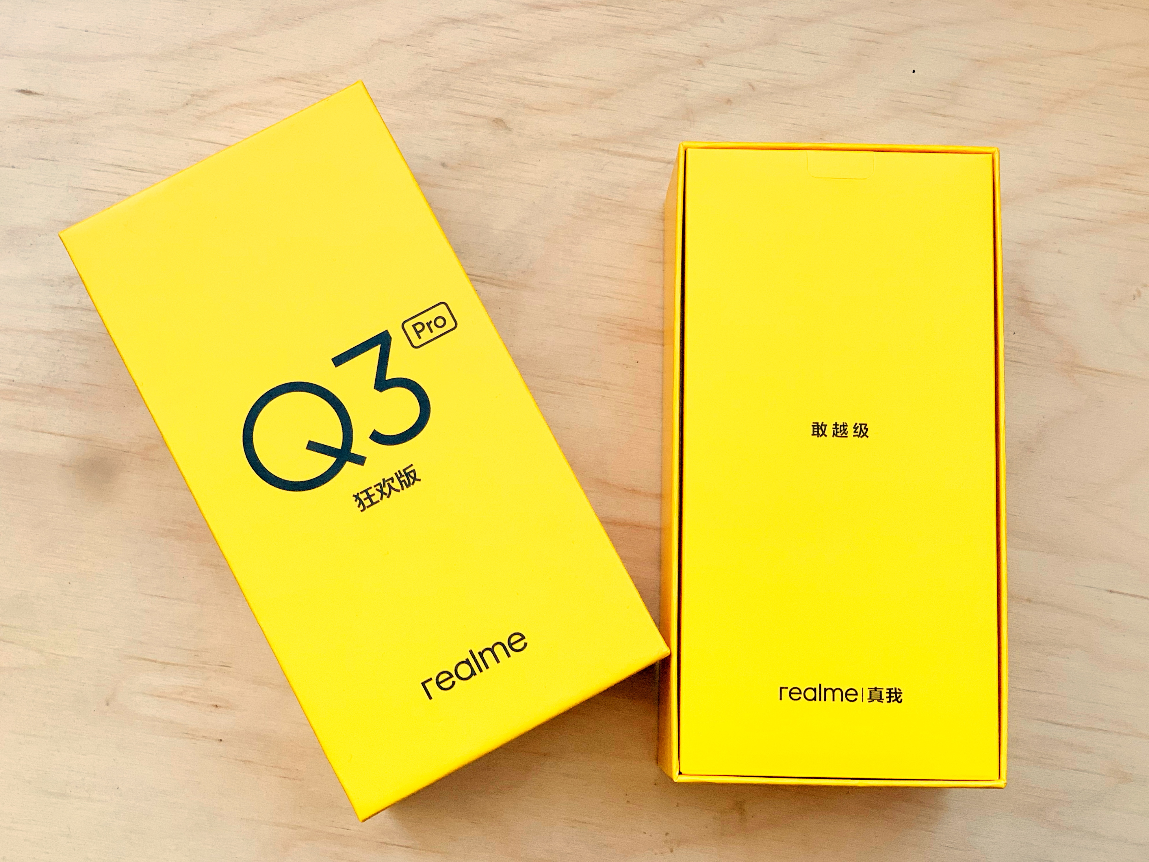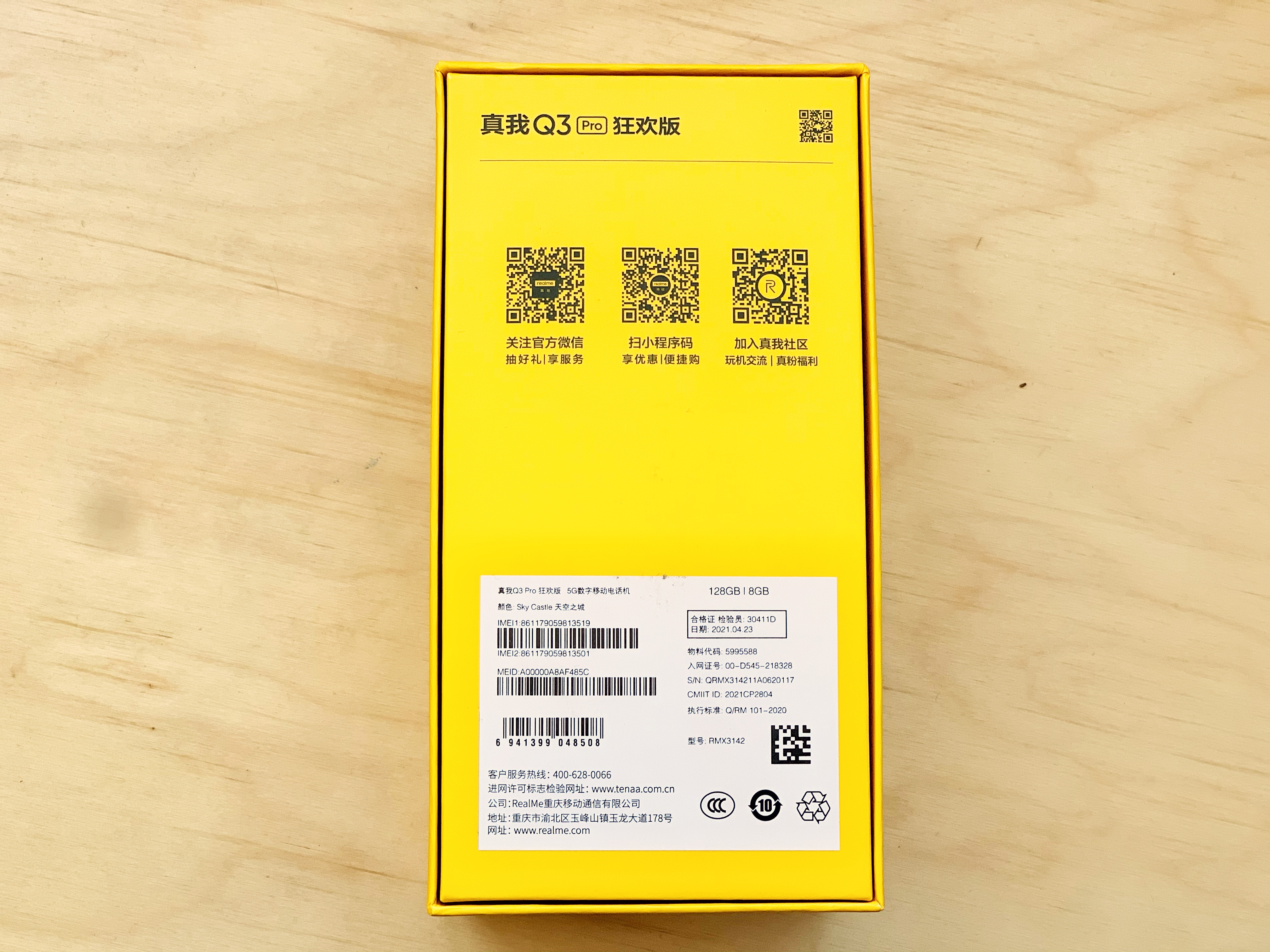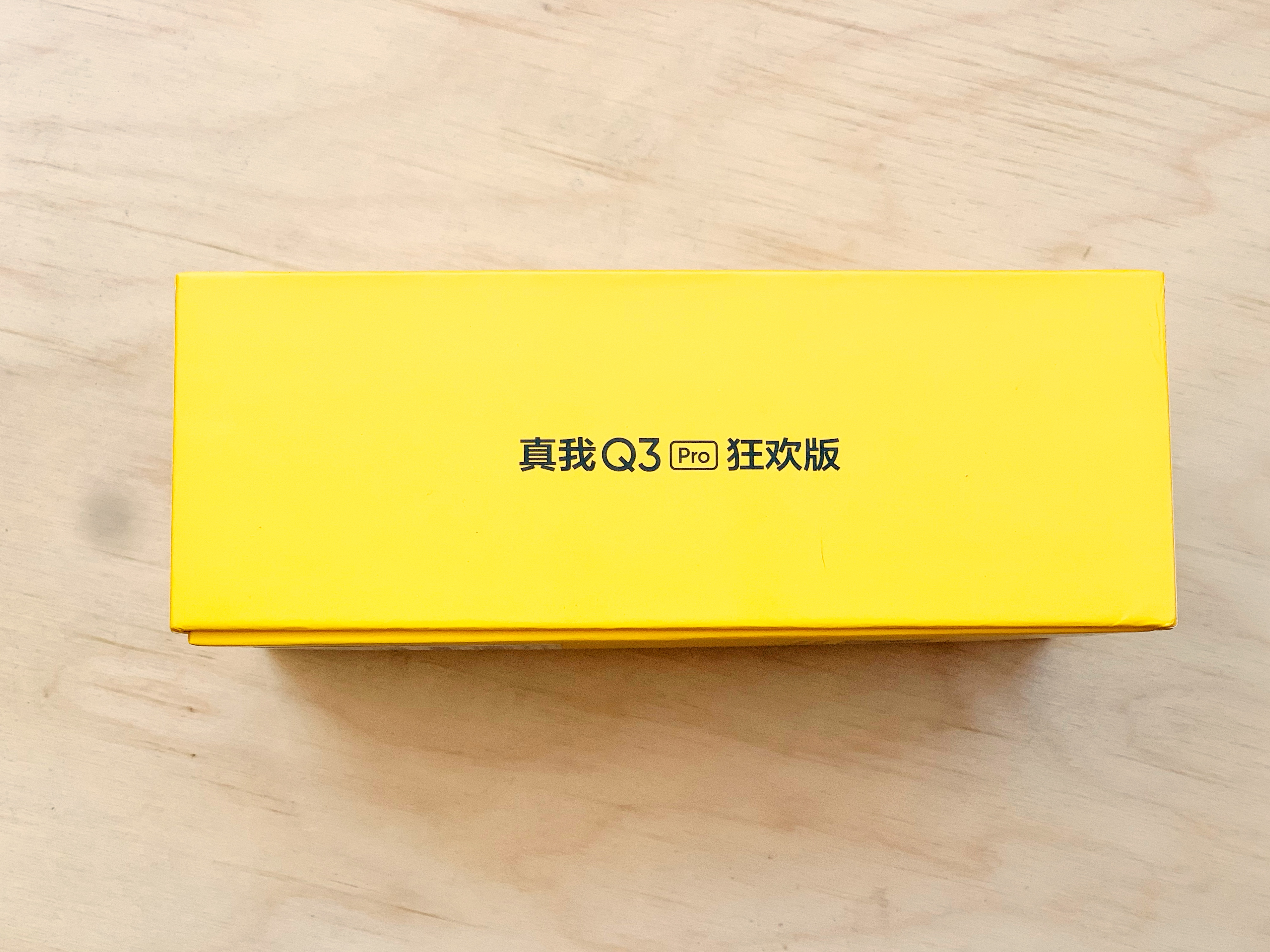 首先,外包装方面依旧传承了realme经典的奶黄色配色,包装盒正面印有占据半屏的“Q3”字样,“Q3”下方的狂欢版,也展示着本款产品的时间定位。包装的侧边“真我 Q3 Pro 狂欢版”让款手机无论身处何处,都有了明显的身份标识。