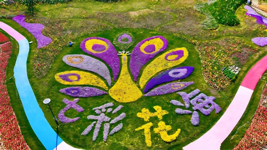 花海由大孔雀、多肉园、百花园、郁金香园等十大核心板块构成。整体以孔雀开屏为核心主题,辅以蝴蝶恋花、蜜蜂飞舞、马到成功等吉祥地面花纹为衬托,将“祝福美好、开心每时每刻”的美好期许藏于每一寸花境之中。全园累计用花约200万盆,涵盖上百个花卉品种,实现万花齐放、四季有景的盛景。