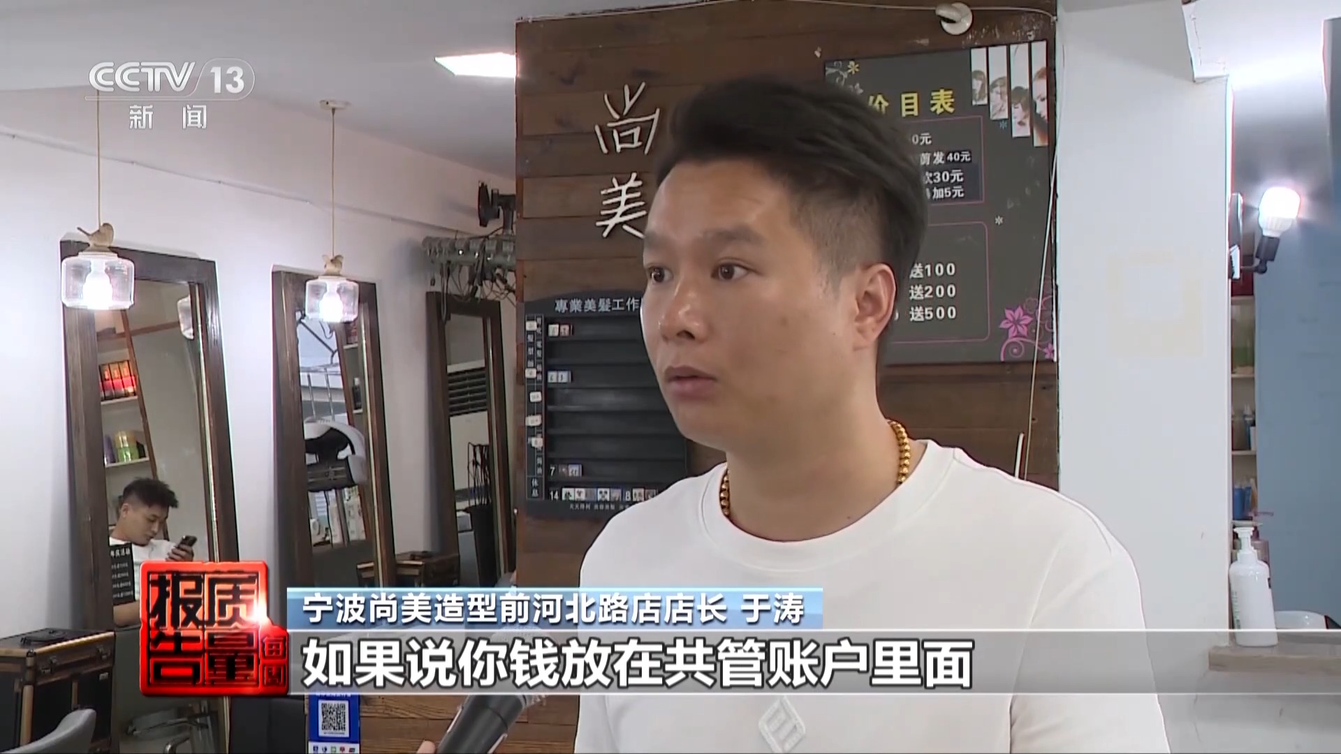 宁波尚美造型前河北路店店长于涛:因为我们做卡的目的,一个可以做流动资金,另外一个目的就是锁客,如果说你钱放在共管账户里面,我们流动资金,什么东西就会受限了。