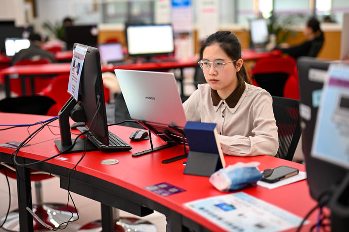 2025年5月7日,在南开大学津南校区,杨雅丽在图书馆修改论文。新华社记者 张铖 摄