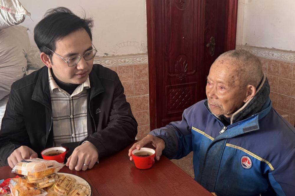 2025年4月1日,陈建(左)在湖南省会同县江边村与石守忠老人交流。新华社记者刘芳洲摄