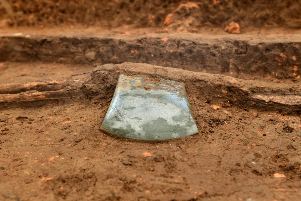 这是2022年12月10日在河南南阳黄山遗址拍摄的屈家岭文化高级别大型墓葬中随葬的玉钺。新华社发(陈辉 摄)