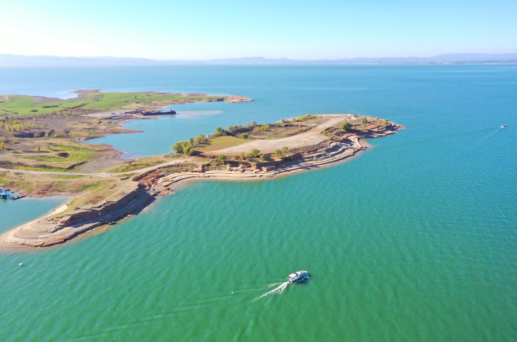 2024年11月29日,在淅川县丹江口水库宋岗码头附近,库区综合执法大队工作人员开船巡护(无人机照片)。新华社记者 郝源 摄