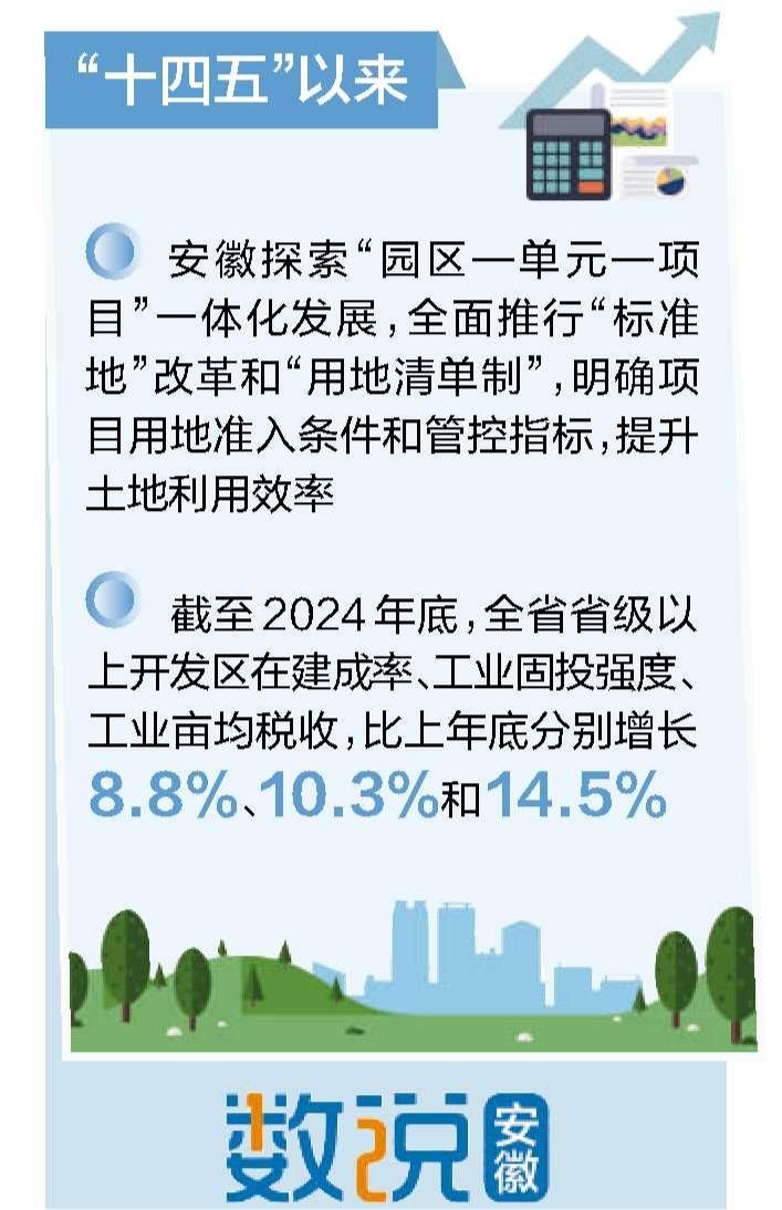 “十四五”以来,安徽探索“园区—单元—项目”一体化发展,明确园区范围、优化功能布局、细化项目准入,推动土地要素从“被动承载体”向“主动生产力”转化。全面推行“标准地”改革和“用地清单制”,明确项目用地准入条件和管控指标,提升土地利用效率。数据显示,截至2024年底,全省省级以上开发区在建成率、工业固投强度、工业亩均税收等方面均有显著提升,比上年底分别增长8.8%、10.3%和14.5%。