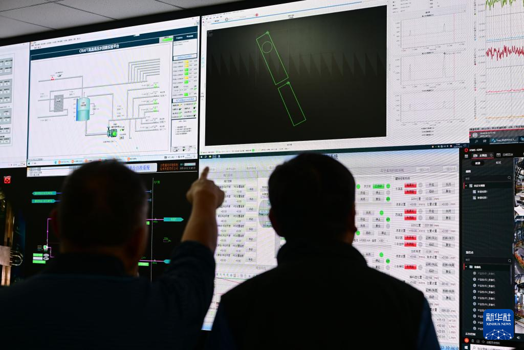 专家组在聚变堆主机关键系统综合研究设施“夸父”(CRAFT)偏滤器原型部件测试现场(10月13日摄)。新华社记者 周牧 摄