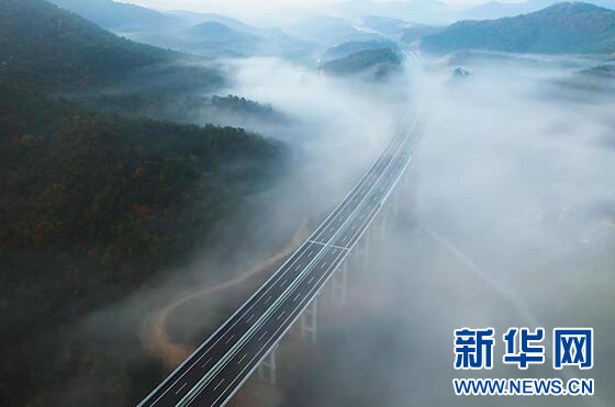 图为刚建成的随信高速穿过云雾缭绕的崇山峻岭。新华网发 卢家国摄