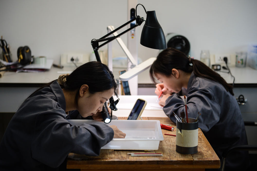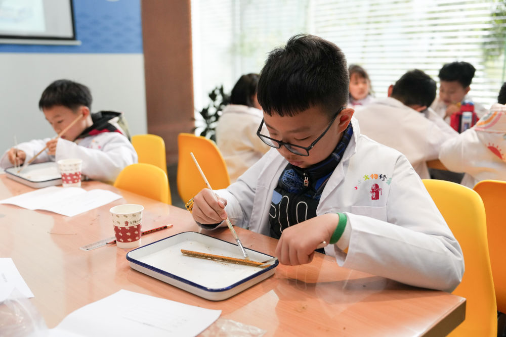 2024年3月16日,孩子们在长沙简牍博物馆参与社会教育活动“探秘简牍的清洗与保护”。
