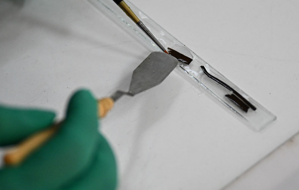 2025年4月24日,荆州文物保护中心简牍工作室工作人员在处理竹简残片。