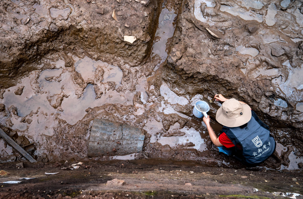 考古工作者在云南河泊所遗址现场进行清理发掘工作(2022年9月21日摄)。近年来,古滇国考古获得重大突破,云南河泊所遗址出土大量汉代封泥和简牍。这表明西汉中央政府已对云南行使治权,是我国统一多民族国家形成与发展的重要实证。