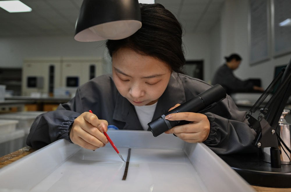 2025年4月24日,荆州文物保护中心简牍工作室工作人员在清理竹简。成立于2003年的荆州文物保护中心简牍工作室承担了全国约80%的简牍保护工作。结合多项重大科研课题研究,中心文保工作者成功研发出一系列竹木简牍保护关键技术,针对饱水简牍出土后因环境改变、水分流失、微生物入侵等导致的病害问题,提供了有效的解决方案。