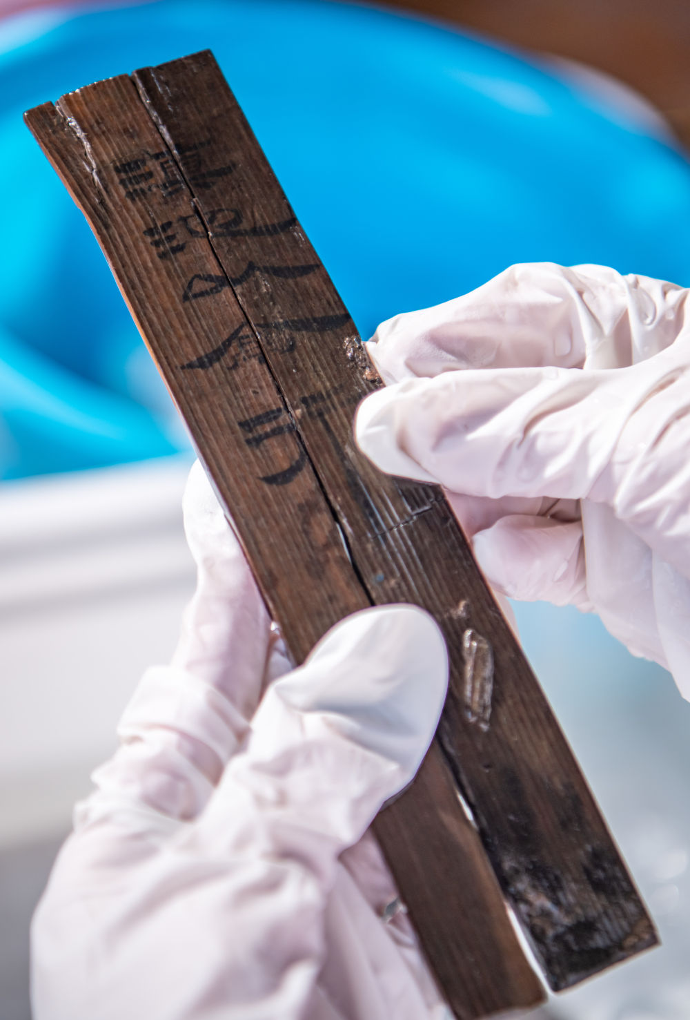 考古工作者在清理云南河泊所遗址出土的简牍(2022年9月21日摄)。