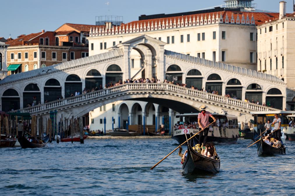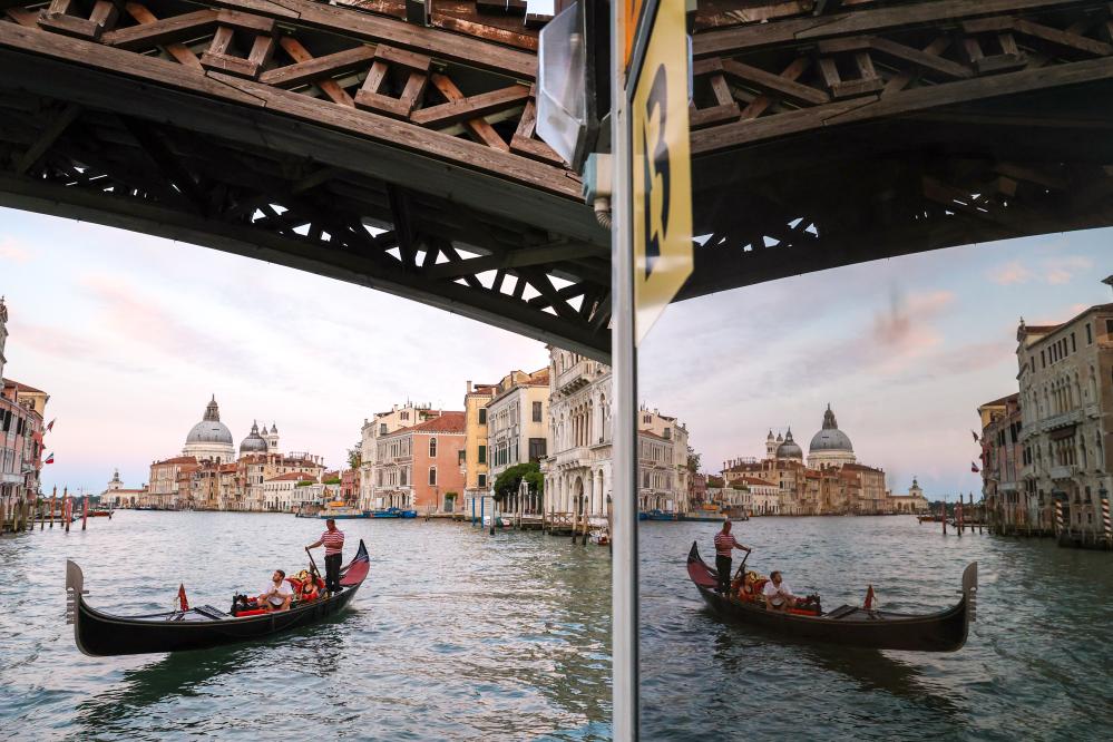 7月16日,在意大利威尼斯,游客乘坐贡多拉游览。新华社记者李京摄