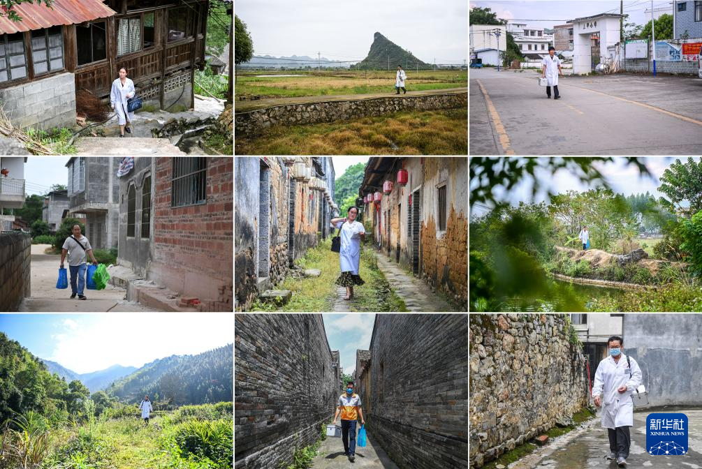 这张拼版照片显示的是乡村医生们行走在出诊途中。 第一排从左至右: 广西龙胜各族自治县龙脊镇白石村乡村医生杨盛祺(2024年7月9日摄);广西钟山县石龙镇松桂村乡村医生潘绍瑜(2024年3月28日摄);广西河池市宜州区德胜镇上坪村乡村医生葛现克(2024年8月15日摄)。第二排从左至右:广西上思县南屏瑶族乡英明村乡村医生王卫江(2019年8月22日摄);广西武宣县东乡镇河马村乡村医生江凤英(2020年6月20日摄);广西贵港市港北区大圩镇中西村乡村医生黄增亮(2023年11月29日摄)。第三排从左至右:广西钟山县花山瑶族乡林坪村乡村医生唐丽红(2023年12月6日摄);广西兴业县石南镇谭良村乡村医生李志辉(2020年5月3日摄);广西天等县龙茗镇益山村乡村医生黄日雷(2020年4月22日摄)。