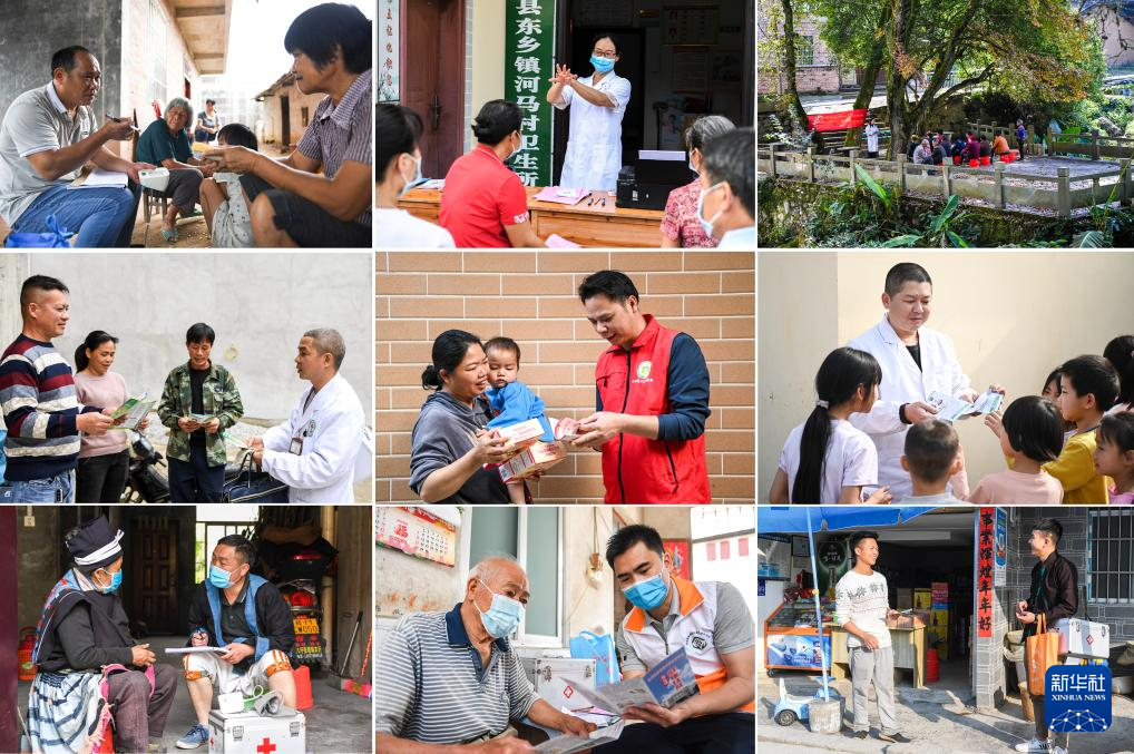 这张拼版照片显示的是乡村医生们在出诊中开展健康咨询及政策宣传工作。第一排从左至右:广西上思县南屏瑶族乡英明村乡村医生王卫江(左一)(2019年8月22日摄);广西武宣县东乡镇河马村乡村医生江凤英(2020年6月20日摄);广西钟山县花山瑶族乡林坪村乡村医生唐丽红(2023年12月6日摄)。第二排从左至右:广西大新县下雷镇仁爱村乡村医生赵建柏(右一)(2021年11月3日摄);广西兴业县石南镇环江村乡村医生梁德和(右一)(2024年2月21日摄);广西昭平县昭平镇玉河村乡村医生李荣坚(2024年3月20日摄)。第三排从左至右:广西南丹县八圩瑶族乡瑶寨村乡村医生黎谋(右)(2020年4月29日摄);广西兴业县石南镇谭良村乡村医生李志辉(右)(2020年5月3日摄);广西凌云县泗城镇平林村乡村医生盘玉盛(右)(2020年4月18日摄)。