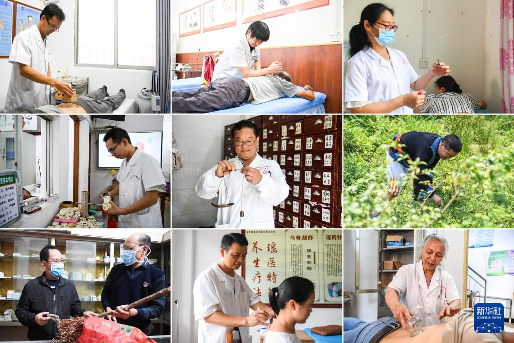 这张拼版照片显示的是乡村医生们使用中医药为患者治疗。第一排从左至右:广西钟山县石龙镇松桂村乡村医生潘绍瑜(2024年8月14日摄);广西河池市宜州区德胜镇上坪村乡村医生葛现克(2024年8月15日摄);广西武宣县东乡镇河马村乡村医生江凤英(2020年6月20日摄)。第二排从左至右:广西东兴市江平镇氵万(左“氵”右“万”,音同“万”)尾村京族乡村医生陆超波(2024年7月19日摄);广西天等县龙茗镇益山村乡村医生黄日雷(2020年4月22日摄);广西南丹县八圩瑶族乡瑶寨村乡村医生黎谋(2020年4月29日摄)。第三排从左至右:广西东兴市江平镇氵万(左“氵”右“万”,音同“万”)尾村京族乡村医生谭国仕(左)(2020年3月31日摄);广西金秀瑶族自治县长垌乡长垌村和桂田村的乡村医生陶雷(左)(2020年7月8日摄);广西钟山县两安瑶族乡竹梅村乡村医生王秋姣(2021年5月11日摄)。