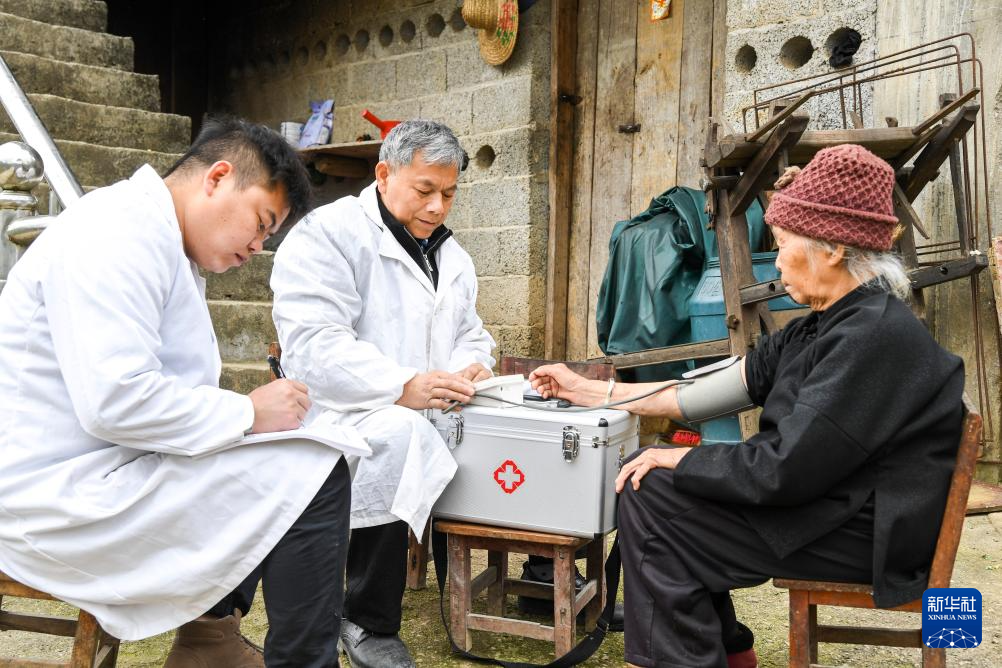 在广西那坡县平孟镇弄汤村,乡村医生赵建华(左二)与赵刚(左一)给村民测量血压(2021年3月11日摄)。