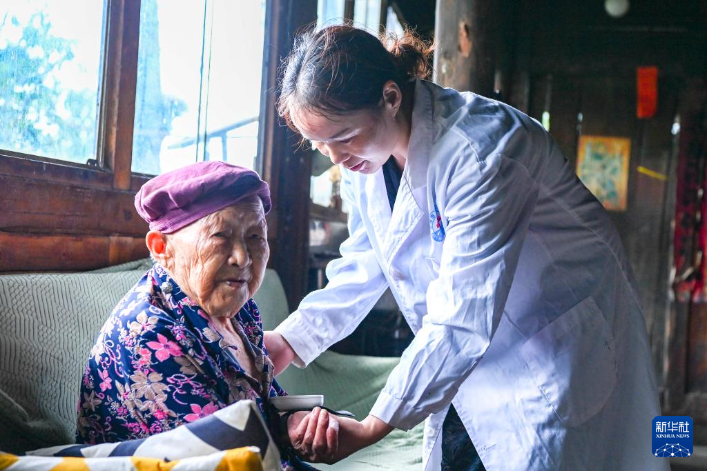 在广西龙胜各族自治县龙脊镇白石村,乡村医生杨盛祺(右)上门为村民测量血压(2024年7月9日摄)。
