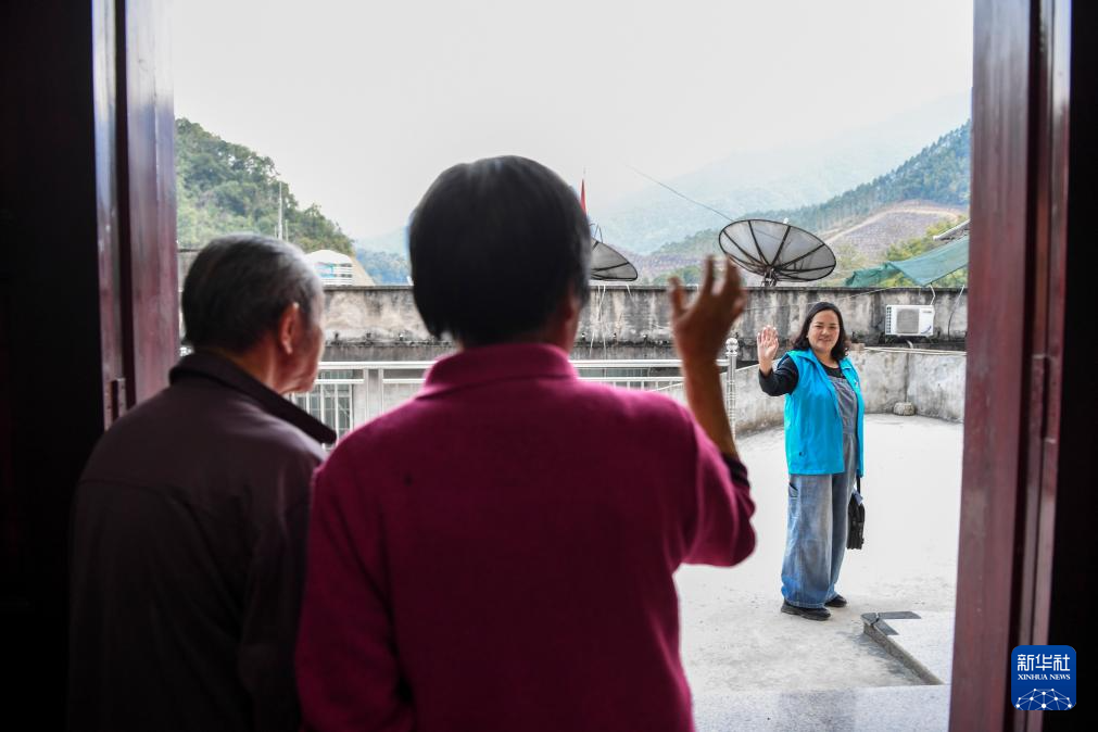 在广西贺州市昭平县昭平镇龙潭村,出诊结束后,乡村医生陈坤(右一)与村民挥手告别(2021年2月23日摄)。