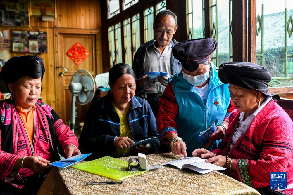 在广西龙胜各族自治县龙脊镇小寨村,乡村医生潘继萍(右二)上门宣传健康知识(2021年5月18日摄)。