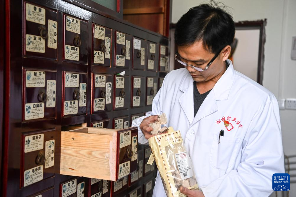 在广西钟山县石龙镇松桂村卫生室,乡村医生潘绍瑜在检查中药材的储存情况(2024年3月28日摄)。