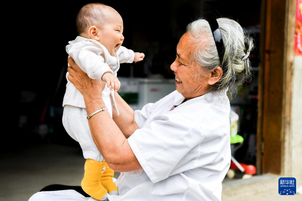 在广西钟山县两安瑶族乡竹梅村,乡村医生王秋姣上门为婴儿体检(2021年5月11日摄)。
