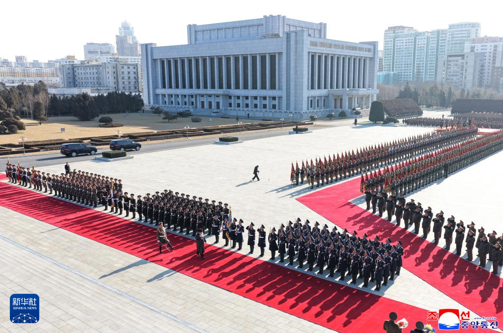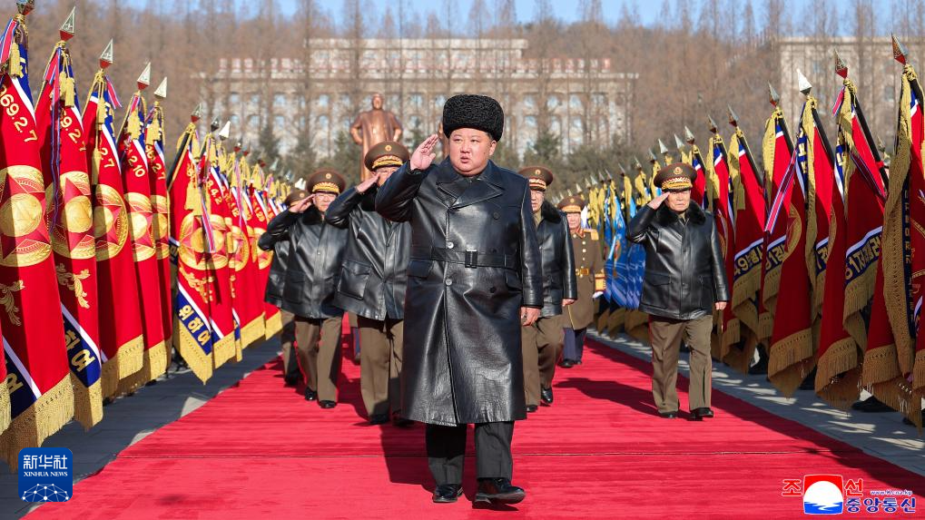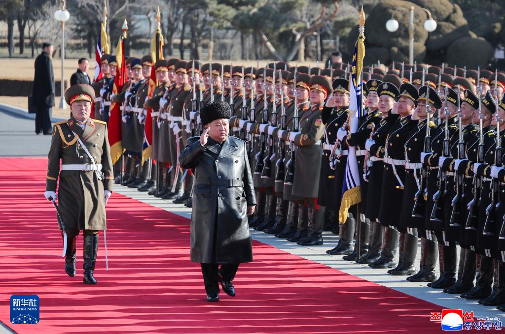 2月8日,朝鲜劳动党总书记、国务委员长金正恩检阅朝鲜人民军仪仗队。新华社/朝中社